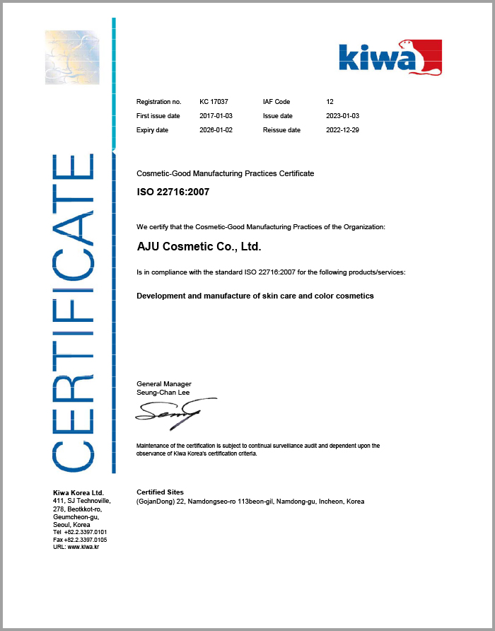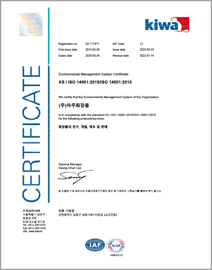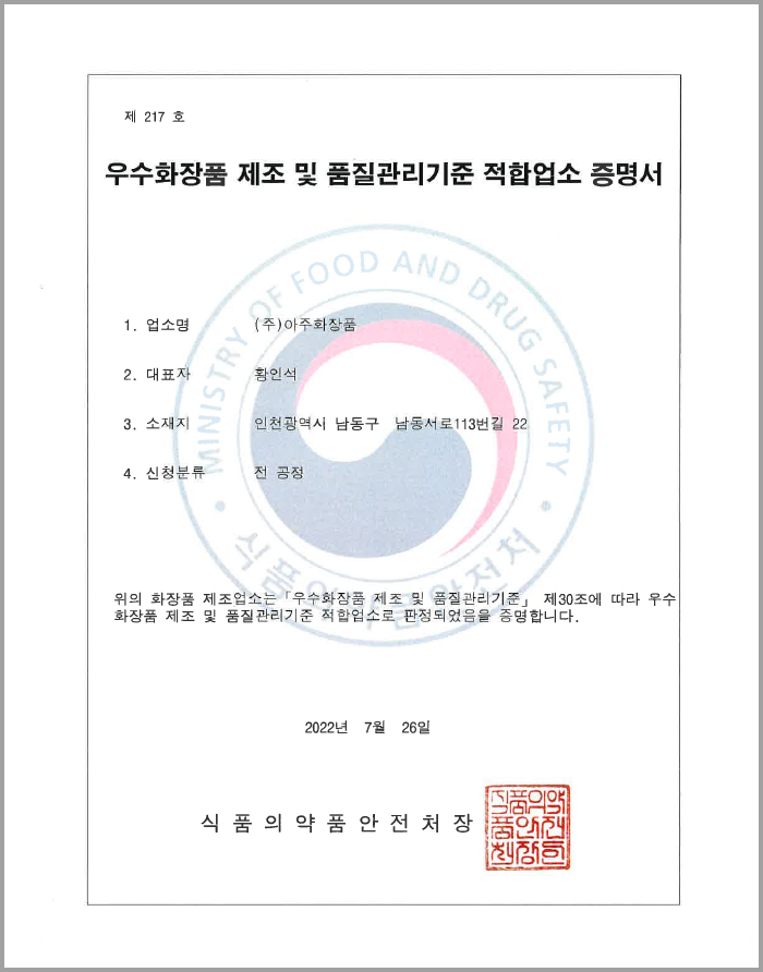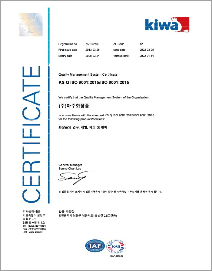 ±¹Á¦ ¿ì¼öÈÀåǰ Á¦Á¶ ¹× ǰÁú°ü¸® ±âÁØ ISO22716, ǰÁú°æ¿µ½Ã½ºÅÛ ISO9001, ȯ°æ°æ¿µ½Ã½ºÅÛ ISO14001À» ÀÎÁõ¹Þ¾Æ ÃÖ»óÀÇ Ç°ÁúÀ» Á¦°øÇϰíÀÚ ³ë·ÂÇϰí ÀÖ½À´Ï´Ù.
